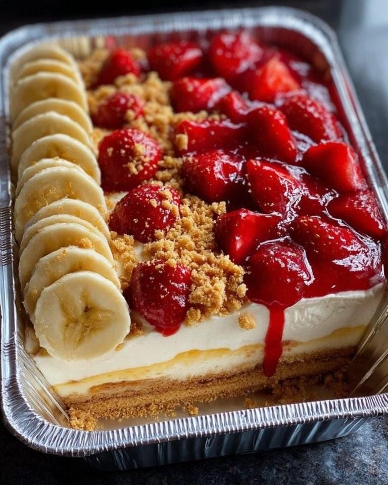 Cheesecake Bicolor de Fresa Crunch y Banana Pudding: Un Postre Irresistible Lleno de Texturas