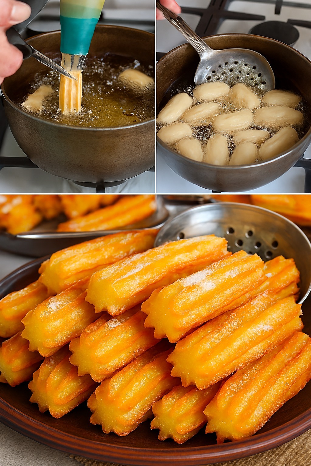 - Fríe los churros hasta que estén dorados por todos lados (aproximadamente 2–3 minutos).