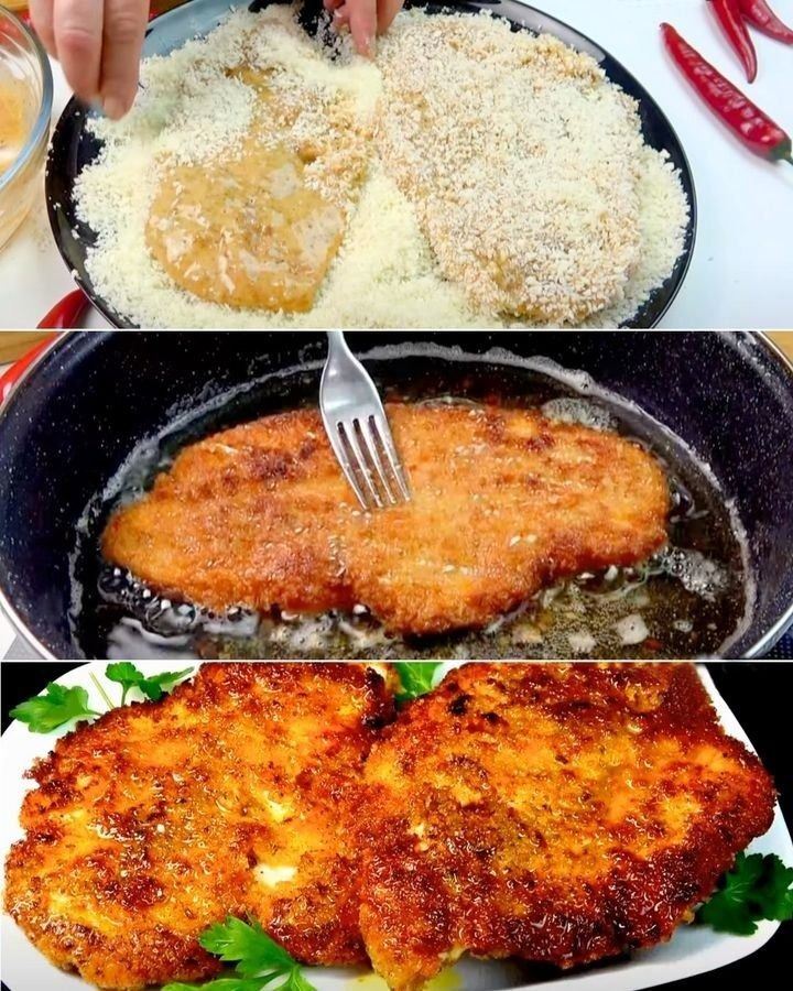 Pechuga de pollo jugosa y crujiente con pan rallado