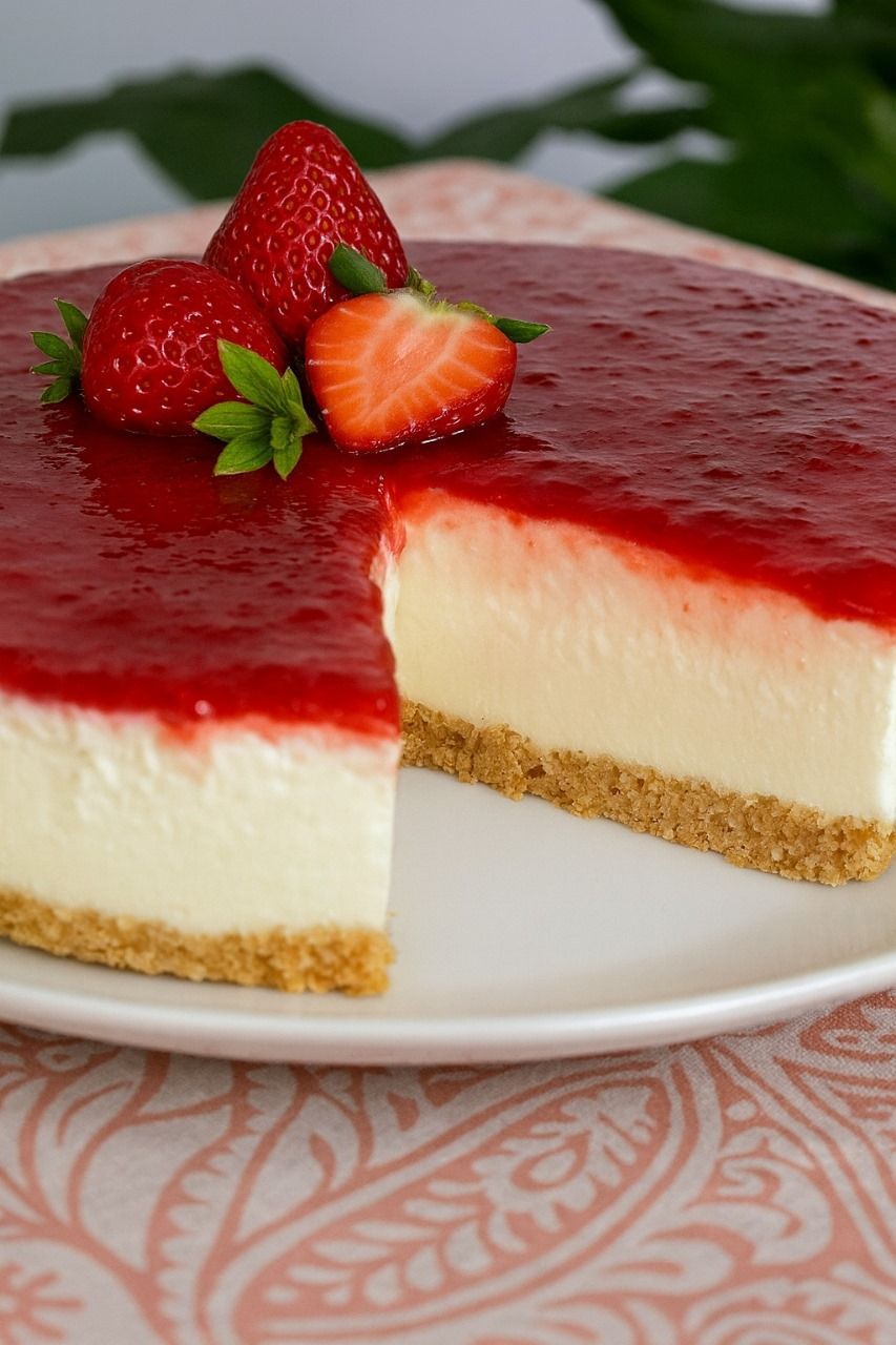 Esta tarta combina una base crujiente de galleta, un relleno de queso cremoso y una cobertura de fresas frescas o en salsa, creando un postre que encanta a todos.